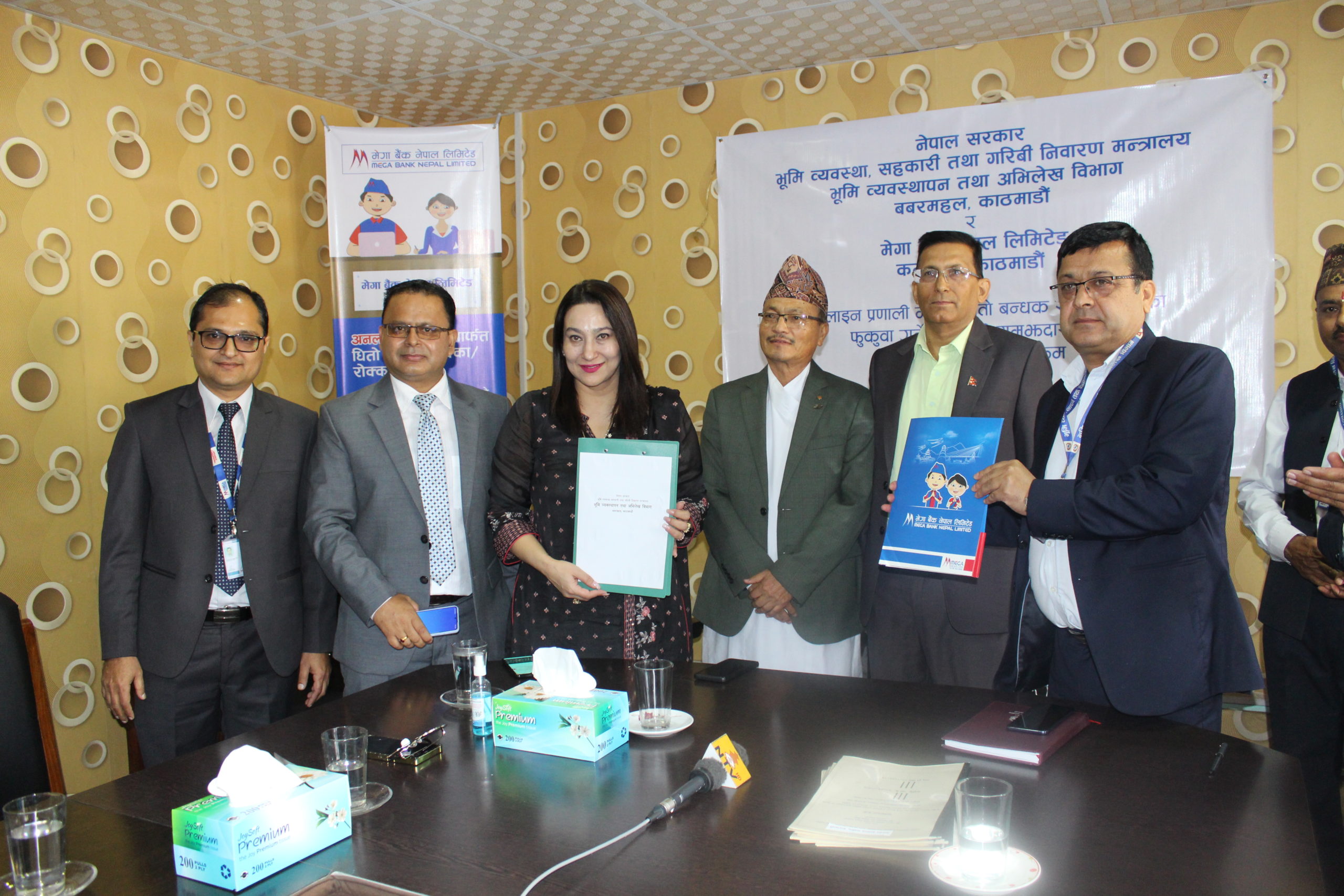 भूमि व्यवस्थापन तथा अभिलेख विभागमा आयोजित समारोहमा भूमि ब्यवस्था, सहकारी तथा गरिबी निवारण मन्त्रालयका सचिव रामप्रसाद थपलिया तथा मेगा बैंक नेपाल लिमिटेडका अध्यक्ष भोजबहादुर शाहको उपस्थितिमा अनलाइन प्रणालीमार्फत धितो बन्धक रोक्का, रोक्का फुकुवा गर्ने सम्बन्धमा समझदारी पत्रमा हस्ताक्षर भयो । समझदारी पत्रमा मेगा बैंकका तर्फबाट कामु प्रमुख कार्यकारी अधिकृत रविना देशराज श्रेष्ठ तथा भूमि व्यवस्थापन तथा अभिलेख विभागका तर्फबाट महानिर्देशक पिताम्बर घिमिरेले हस्ताक्षर गरे ।