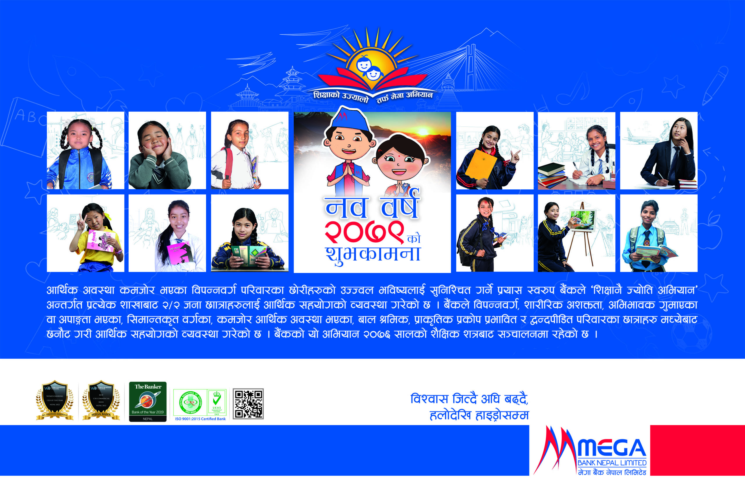 आर्थिक अवस्था कमजोर भएका विपन्नवर्ग परिवारका छोरीहरुको उज्ज्वल भविष्यलाई सुनिश्चित गर्ने प्रयास स्वरुप मेगा बैंकले ‘शिक्षा नै ज्योति अभियान’ अन्तर्गत देशभरका प्रत्येक शाखाबाट २–२ जना छात्राहरुलाई आर्थिक सहयोगको व्यवस्था गरेको बैंकले जनाएको छ।