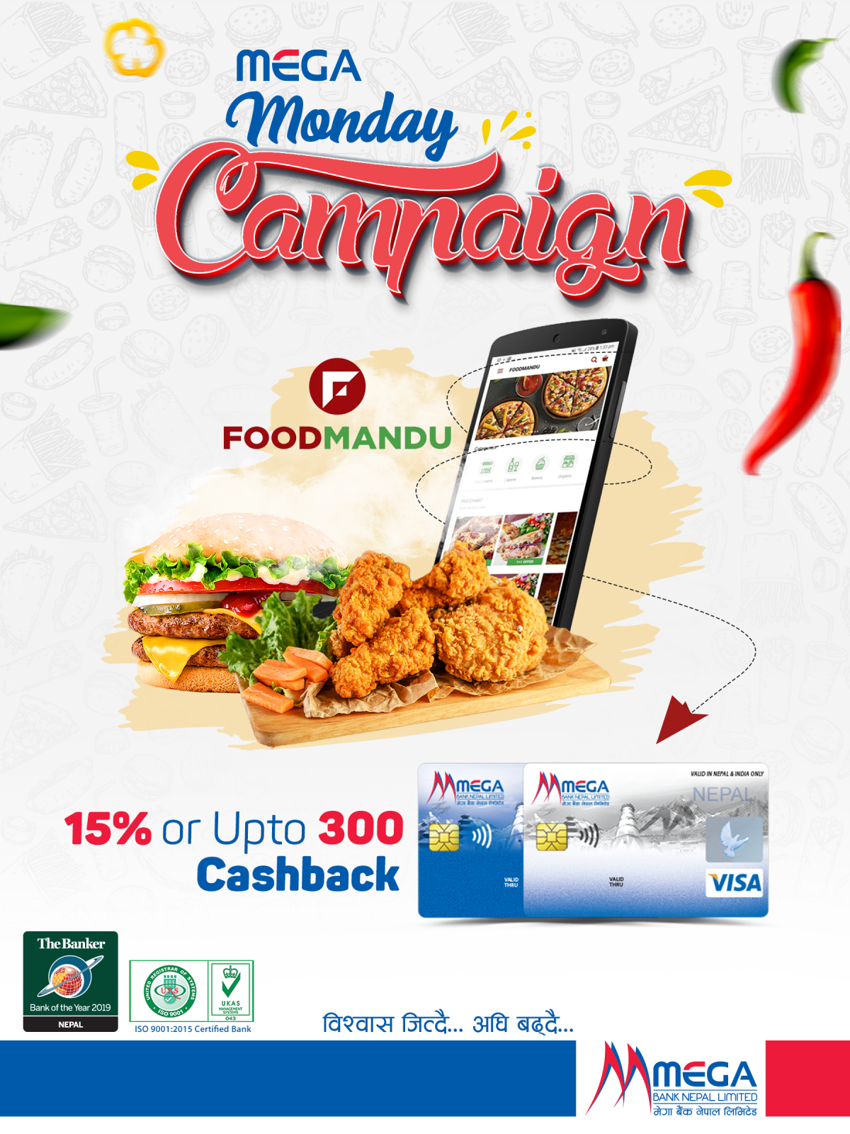 फुण्डमाण्डूसँगको सहकार्यमा ‘मेगा मण्डे’ नामक अभियानको संचालन गर्दै मेगा बैंकले हरेक सोमबार १५ प्रतिशत छुट अथवा ३ सय रुपैंयासम्मको ‘क्यासब्याक’ अफर ल्याएको हो । यस अभियान अन्तर्गत मेगा बैंकको डेबिट तथा क्रेडिट कार्ड प्रयोगकर्ताले फूडमाण्डूको एप्स प्रयोग गरी रकम भुक्तानी गर्नुपर्नेछ ।
