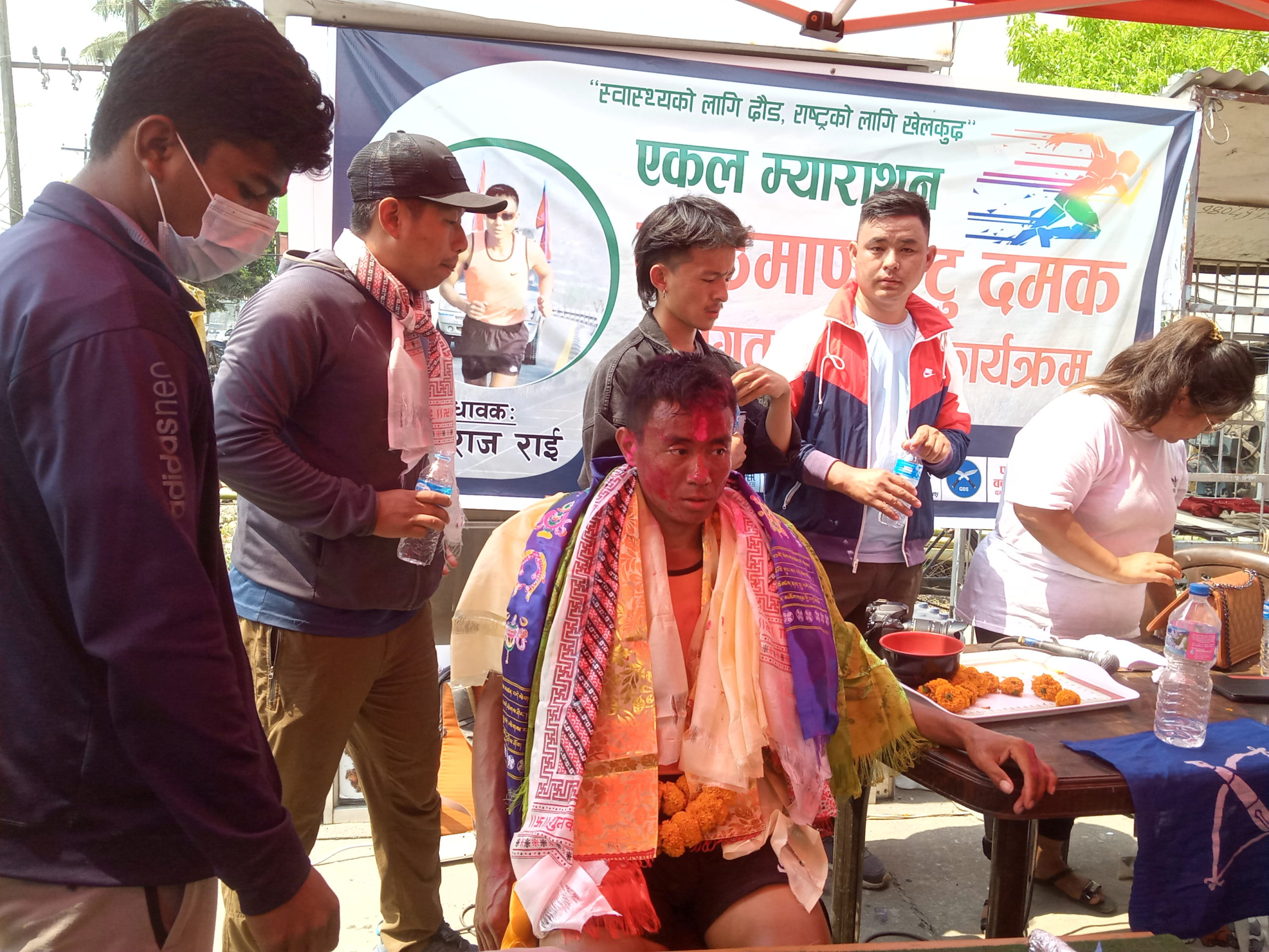 ३० फागुन बिहान काठमाडौंबाट हिँडेका उनी शनिबार दमक आइपुगे । ‘स्वास्थ्यका लागि दौड राम्रो हो,’ उनी भन्छन्, ‘राष्ट्र चिनाउने माध्यम पनि खेलकुद हो ।’ व्यक्तिले नै यति ठूलो आँट र सहास गर्दा पनि राज्य पक्षबाट सहयोग नपाएको उनको गुनासो छ । ‘मलाई विभिन्न संघसंस्थाले दमकसम्म दौडन सहयोग गरे । तर, सरकारी पक्षबाट केही सहयोग भएन,’ उनी भन्छन्, ‘यसले राज्य पक्ष खेलाडीका लागि उदार छैन भन्ने देखाउँछ ।’