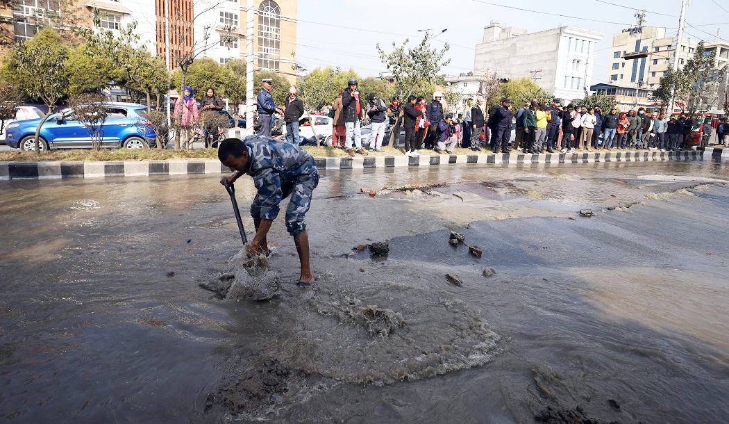 पाइप फुटेपछि सडक, सरकारी कार्यालय लगायत क्षेत्र जलमग्न भएको छ ।