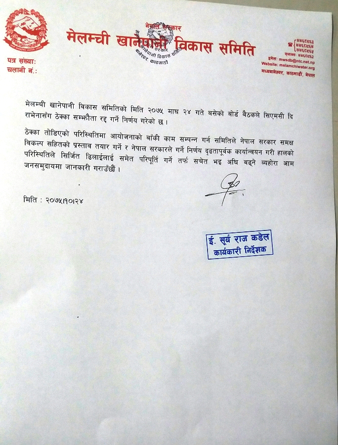अन्तिम समयमा आएर सिएमसीसँग सिंगापुरमा वार्ता गरिएपनि कुनै सहमति जुट्न नसकेपछि मेलम्ची खानेपानी आयोजनाले अन्ततः बिहीबार ठेक्का रद्द गरेको घोषणा गरेको हो। मेलम्चीको काम छाडेर ठेकेदार कम्पनी स्वदेश गएपछि सरकारले फर्काउन पटकपटक प्रयास गरेको थियाे।