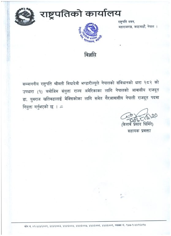 राष्ट्रपति भण्डारीले संविधानको धारा २८२ को उपधारा १ बमोजिम डा. खतिवडालाई मेक्सिकोका लागि गैरआवासीय नेपाली राजदूतमा नियुक्त गरेकी हुन् ।