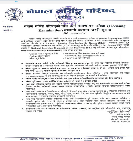 परिषदले एक सूचजना जारी गर्दै नाम दर्ता प्रमाणपत्रका लागि प्रवीणता प्रमाणपत्र तह नर्सिङ, वीएस्सी नर्सिङ, मिडवाइफको परीक्षा चैत ७ गते हुने जानकारी दिएको हो ।