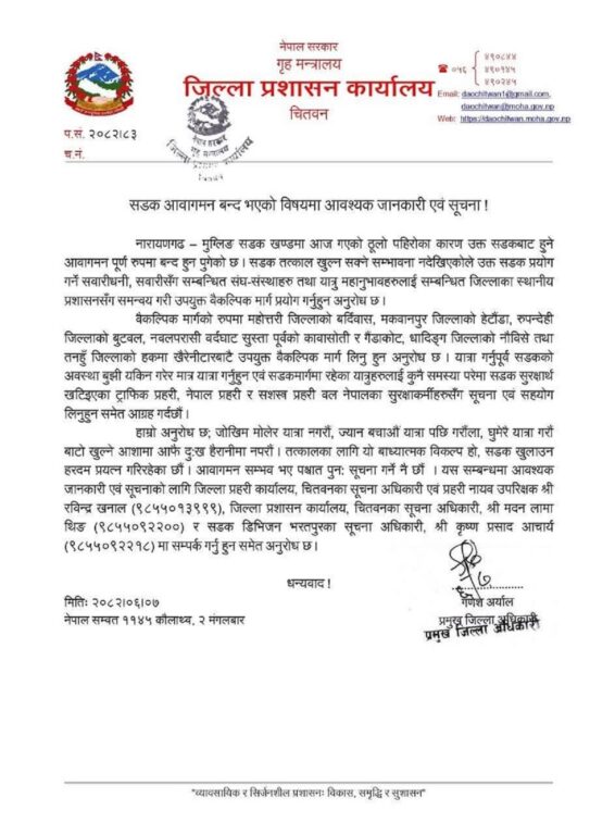 यस सम्बन्धमा आवश्यक सूचना तथा जानकारीको लागि जिल्ला प्रहरी कार्यालय चितवनका सूचना अधिकारी रवीन्द्र खनाल (मोबाइल नम्बर ९८५५०१३९९९, जिल्ला प्रशासन कार्यालय चितवनका सूचना अधिकारी मदन लामा थिङ मोबाइल नम्बर ९८५५०९२२०० र सडक डिभिजन भरतपुरका सूचना अधिकारी कृष्णप्रसाद आचार्य मोबाइल नम्बर९८५५०९२२१८) लाई सम्पर्क गर्न समेत कार्यालयले अनुरोध गरेको छ ।