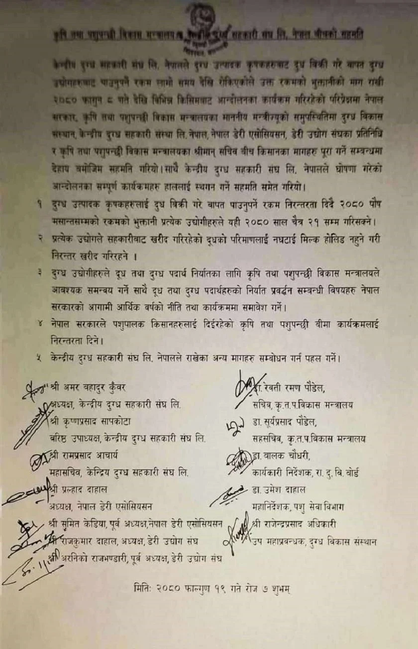 काठमाण्डु- आन्दोलनरत दुग्ध किसान र नेपाल सरकारबीच ५ बुँदे सहमति भएको छ । आज सरकार र दुग्ध किसानबीच सहमति भएसँगै आन्दोलनका स्थगन भएको हो ।