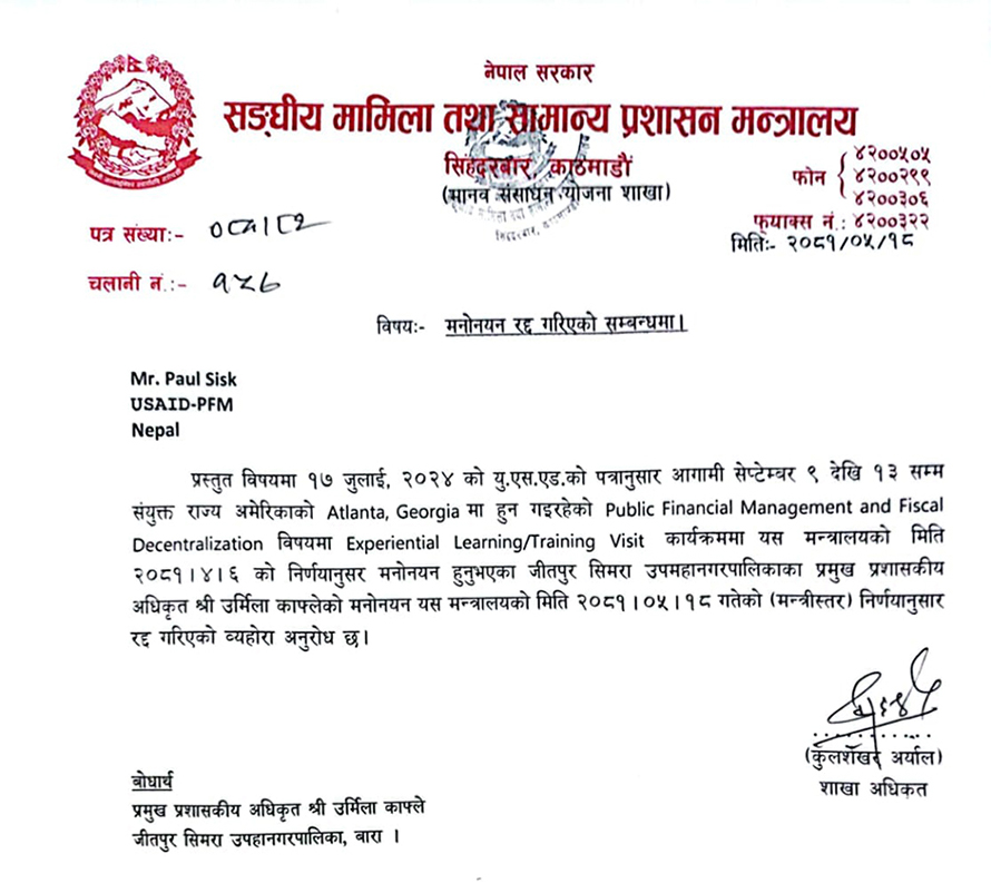 यस्तो छ मनोनयन रद्द गरिएको पत्र –