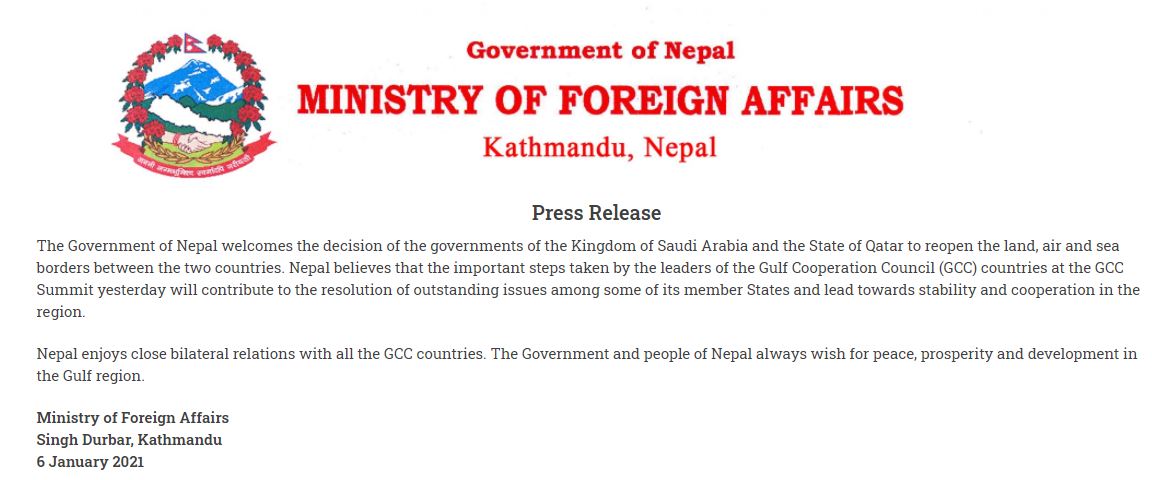 ‘नेपाल सरकार स्थलगत, हवाई र समुन्द्रि सीमा खोल्ने साउदी अधिराज्य र कतार अधिराज्यको निर्णयको स्वागत गर्दछ,’ विज्ञप्तिमा भनिएको छ, ‘गल्फ कोअपरेसन काउन्सिल (जिसससी) देशका नेताहरुले हिजोको सम्मेलनबाट लिएको कदमले केही सदस्य राष्ट्रहरुबीचको विवादको समाधान गर्न तथा यो क्षेत्रमा स्थायित्व र सहकार्य बढाउन योगदान गर्नेछ भन्ने नेपाल विश्वास गर्छ । नेपाल सरकार र नेपाली जनता खाडी क्षेत्रमा सधै शान्ति, समृद्धि र विकास चाहान्छन् ।’