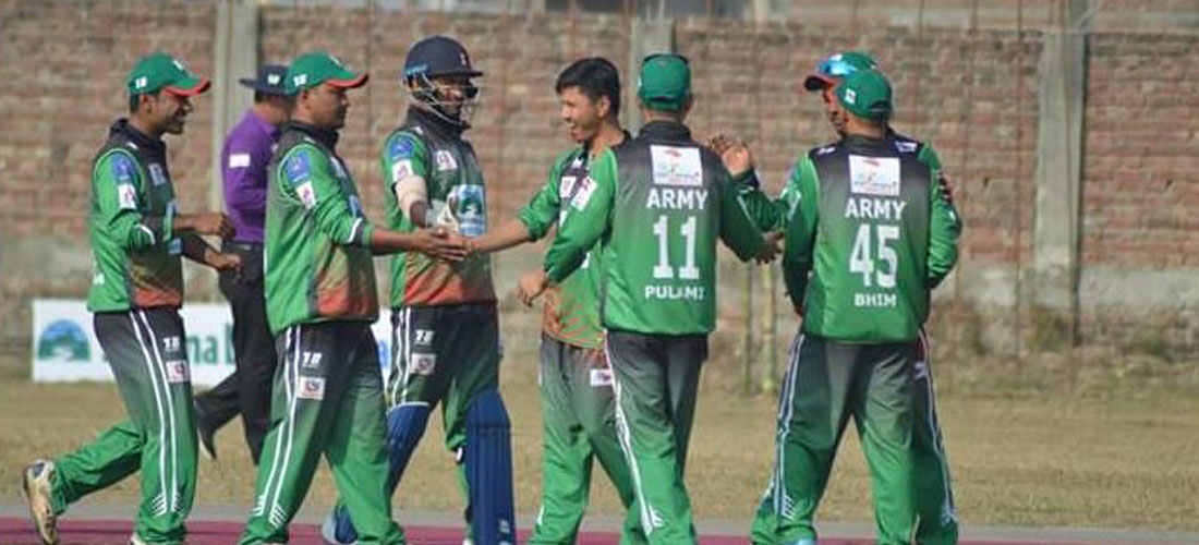 आज भएको खेलमा आयोजक मनमोहन मेमोरियल क्रिकेट सेन्टर (एमएमसीसी) माथि १० विकेटको जित निकाल्दै आर्मीले सेमिफाइनलमा पुगेको हो । इनरुवा रंगशालामा एमएमसीसीले दिएको ५७ रनको लक्ष्य आर्मीले ५ ओभरमा पूरा ग¥यो । आर्मीका लागि कुशल मल्लले अविजित ३५ रन जोड्दा हरिकृष्ण झाले २० रन बनाए ।