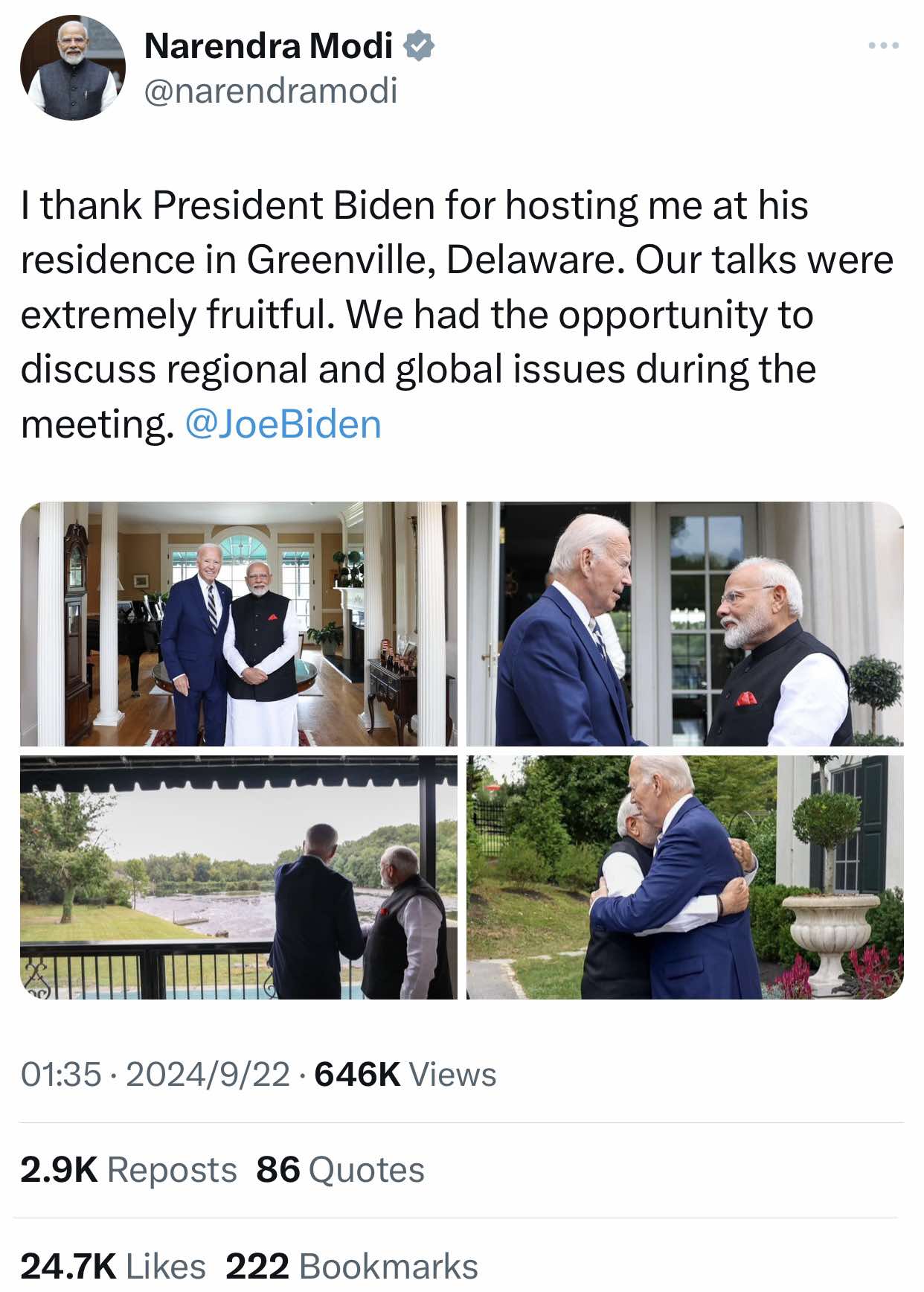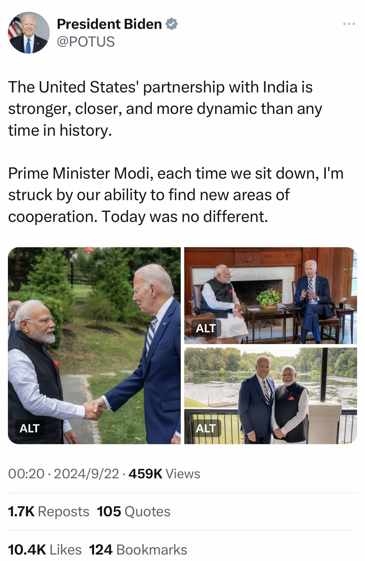 सामाजिक सञ्जालमा बाइडेनले मोदीलाई स्वागत गरेको तस्विर सार्वजनिक गदै मोदीसँगको हरेक भेट फरक हुने गरेको र हरेक मुद्दामा सहकार्य गर्न तयार हुने बताएका छन् ।