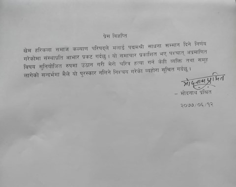 ‘खेम हरिकला समाज कल्याण परिषदले मलाई पद्मश्री साधना सम्मान दिने निर्णय गरेकोमा संस्थाप्रति आभार प्रकट गर्दछु’, प्रश्रितले भनेका छन्, ‘यो समाचार प्रकाशित भएपछि अप्रमाणित विषय सुनियोजित रुपमा उठान गरी मेरो चरित्र हत्या गर्न केही व्यक्ति तथा समूह लागेको सन्र्दभमा मैले यो पुरस्कार नलिने निश्चय गरेको व्यहोरा सूचित गर्दछु ।’