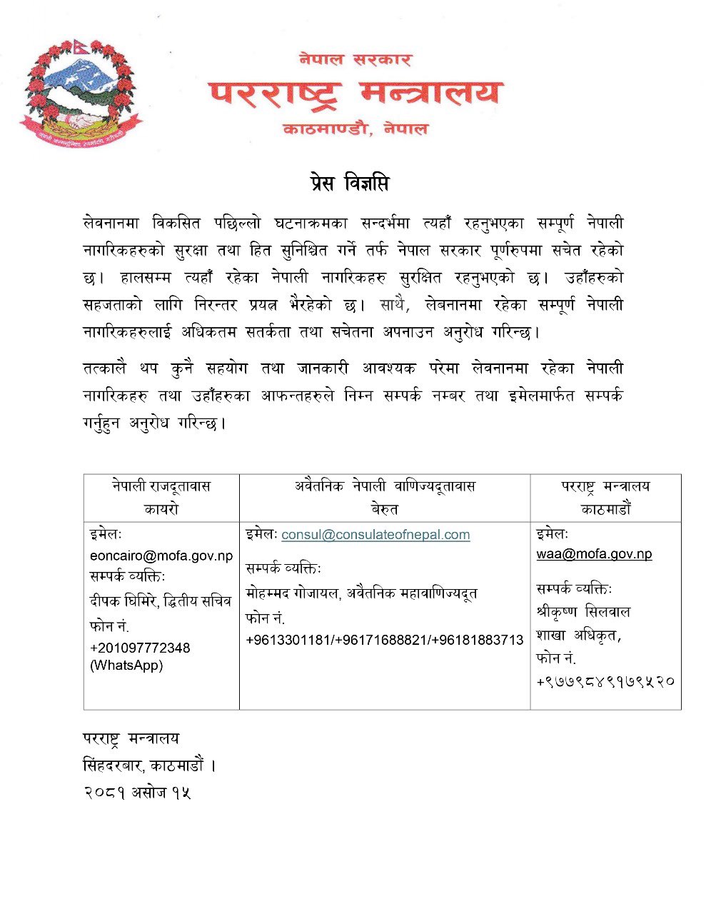 कुनै अप्ठ्यारो परेमा सम्पर्क गर्न भन्दै मन्त्रालयले नेपाली राजदूतावास कायरो, अवैतनिक नेपाली वाणिज्यदूतावास बेरुत र परराष्ट्र मन्त्रालयका कर्मचारीहरुको नाम, सम्पर्क नम्बर र इमेल ठेगाना पनि सार्वजनिक गरेको छ ।