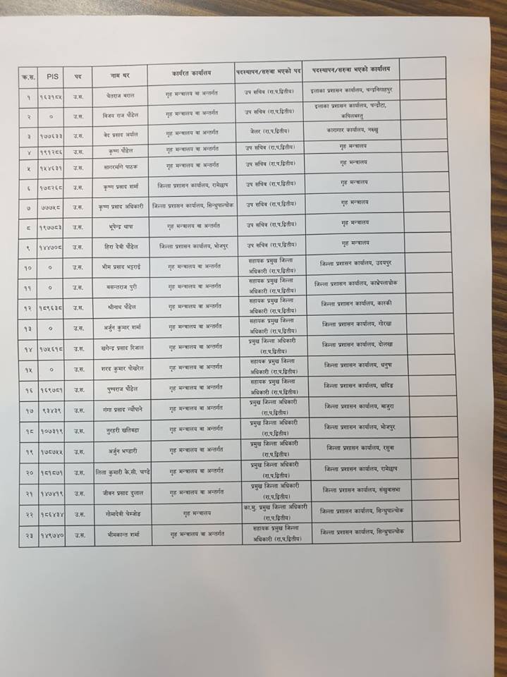 नख्खु कारागारको प्रमुखमा बेद प्रसाद अर्याललाई पठाएको छ।  रामेछापका प्रमुख जिल्ला अधिकारी कृष्ण प्रसाद शर्मा र भोजपुरकी प्रजिअ हिरा देवी पौडेललाई मन्त्रालय सरुवा गरिएको छ ।
