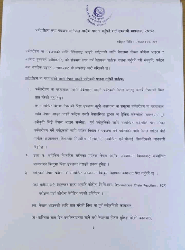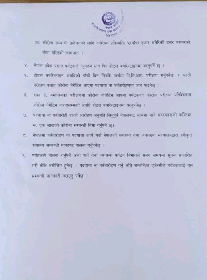 त्यस्तै पर्यटकले पाँच हजार अमेरिकी डलरको बिमा गरिएको कागजात पेश गर्नुपर्नेछ । साथै पदयात्रा वा पर्वतारोही दलले आरोहण अनुमति लिनुपूर्व नेपालबाट साथमा जाने सदस्यको कम्तीमा १ लाख रुपैयाँको कोरोनासम्बन्धी बिमा गर्नुपर्ने मन्त्रालयले जनाएको छ ।