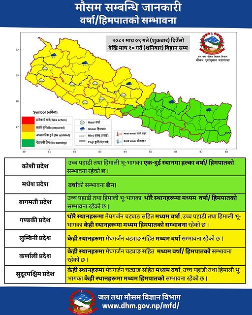 शुक्रबार लुम्बिनी प्रदेश, कर्णाली प्रदेश र सुदूरपश्चिम प्रदेशका केही स्थानहरूमा तथा गण्डकी प्रदेशका थोरै स्थानहरूमा मेघगर्जन र चट्याङसहित मध्यम वर्षा, गण्डकी प्रदेश, कर्णाली प्रदेश र सुदूरपश्चिम प्रदेशको उच्च पहाडी तथा हिमाली भूभागका केही स्थानहरूमा मेघगर्जन चट्याङसहित मध्यम हिमपात र वर्षाको सम्भावना छ।