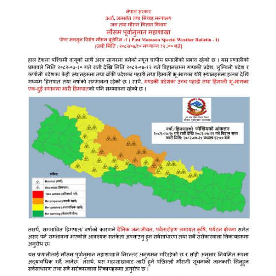 बुधबार बिहानसम्म गण्डकी प्रदेश, लुम्बिनी प्रदेश र कर्णाली प्रदेशका केही स्थानहरुमा तथा बाँकी प्रदेशका पहाडी तथा हिमाली भू–भागका थोरै स्थानहरुमा हल्का देखि मध्यम हिमपात तथा वर्षाको सम्भावना रहेको र गण्डकी प्रदेशका उच्च पहाडी तथा हिमाली भू-भागका एक–दुई स्थानमा भारी हिमपातको पनि सम्भावना रहेको बुलेटिनमार्फत जानकारी दिइएको छ ।