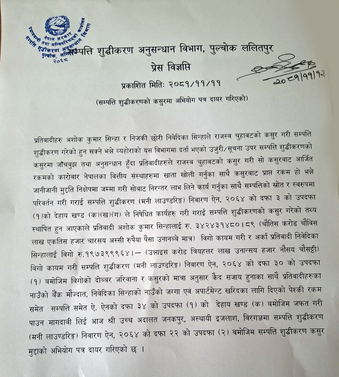 विभागले सोमबार प्रेस विज्ञप्ति जारी गर्दै भनेको छ, ‘अशोक कुमार सिन्हा र निजकी छोरी निवेदिका सिन्हाले राजस्व चुहावटको कसुर गरी सम्पत्ति शुद्धीकरण गरेको हुन सक्ने भन्ने व्यहोराको यस विभागमा दर्ता भएको उजुरीउपर सम्पत्ति शुद्धीकरणको कसुरमा जाँचबुझ तथा अनुसन्धान हुँदा प्रतिवादीहरूले राजस्व चुहावटको कसुर गरी सो कसुरबाट आर्जित रकमको कारोबार नेपालका वित्तीय संस्थाहरूमा खाता खोली गरेको देखिएको छ ।’