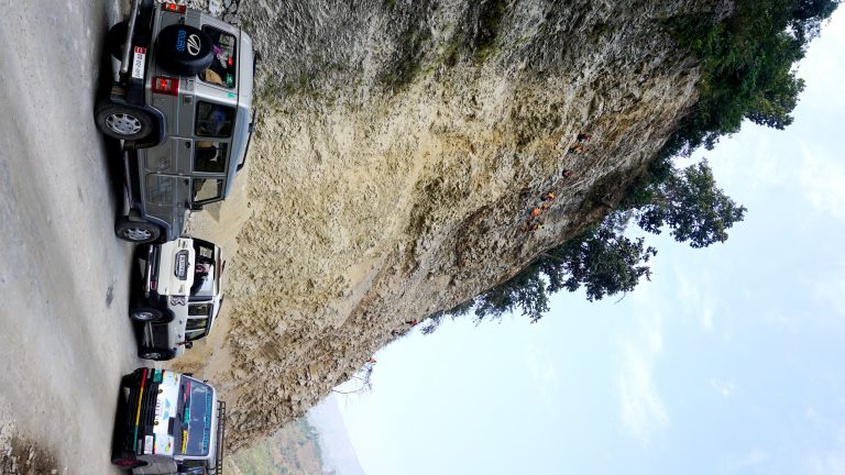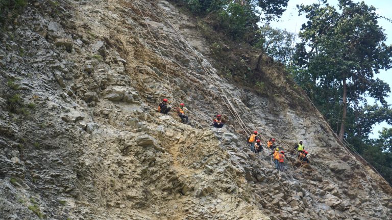 ‘रक क्लाइम्बिङ’ खेल जस्तै टल्कने ज्याकेट र पहेँलो हेल्मेट लगाएका मजदूर भिरभिरमा छन् । एक त पहिरो खस्ने जोखिम, त्यसमाथि ठाडे भिरमा चट्टान खोप्नु अत्यन्तै सकसपूर्ण काम हो । मजदूर जोखिम मोलेर दुई सातादेखि पहिरो रोक्न क्रियाशील छन् ।