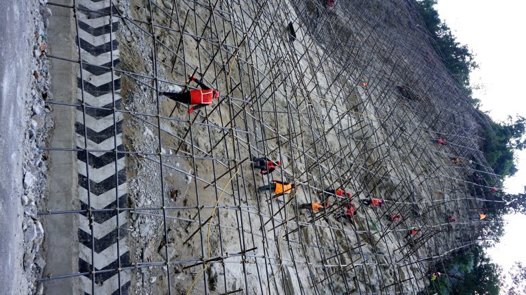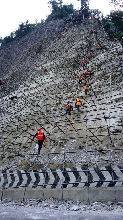 मजदूर कतै फलामको डण्डीको भर्याङ (स्काफोल्डिङ)मा बसेर काम गरिरहेका छन् त कतै रुखमा बाँधिएको डोरीको अङ्कुशेमा अडिएर काममा व्यस्त छन् । कोही जाली बिच्छ्याउँदै र कोही चट्टानमा रड (किला) ठोकेर नटबोल्टको काम गरिरहेका छन् ।