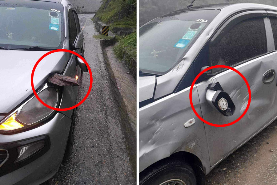 काठमाण्डु– नारायणगढ मुग्लिन सडकखण्डमा गुडिरहेको कारमाथि ढुंगा खसेकाे छ ।