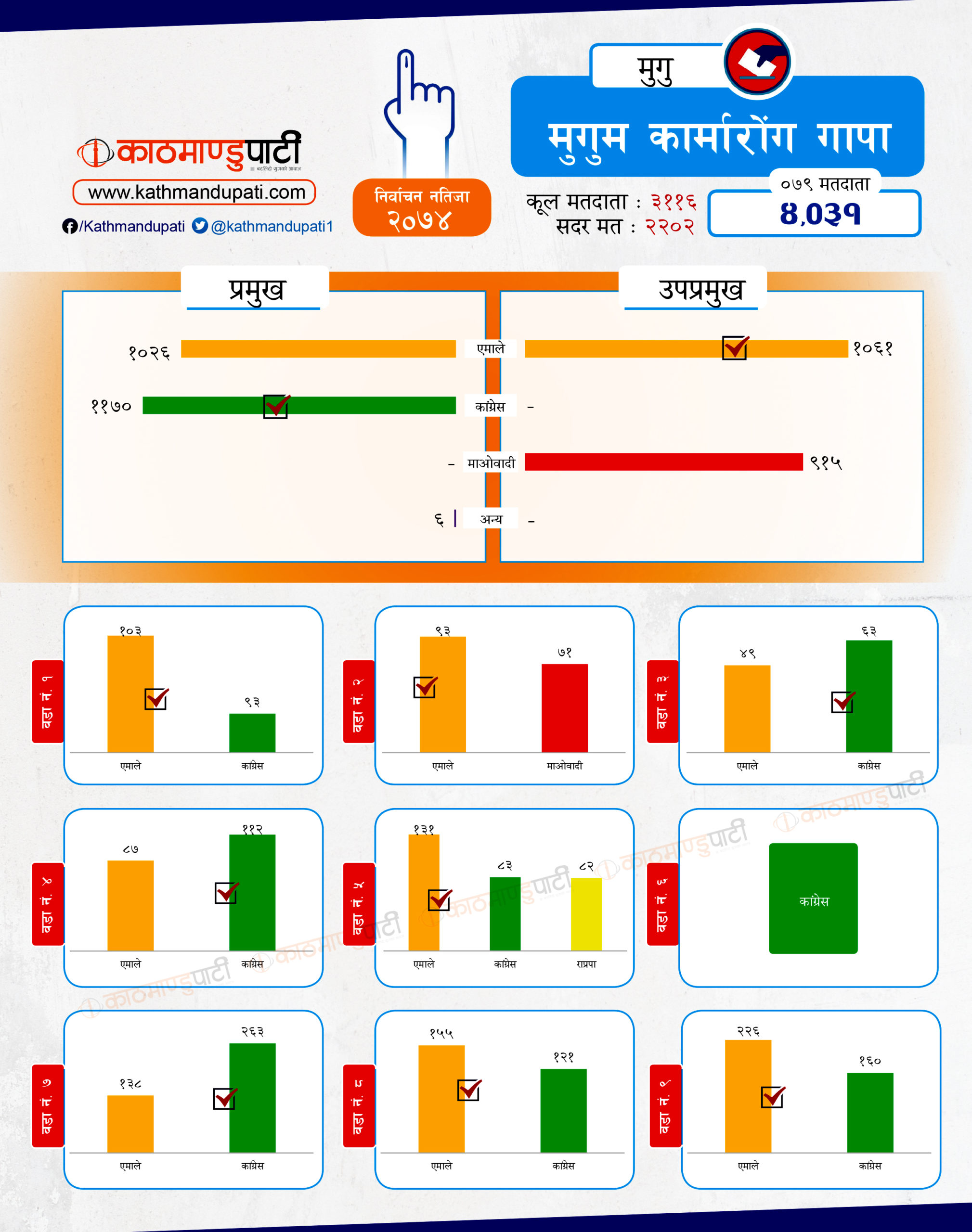 यसले जिल्लामा एमालेलाई ठूलो झट्का लागेको छ । त्यसैले संघीय सत्ता चलाइरहेका दलबीच गठबन्धन भयो भने यसपटक मुगुमा एमाले शून्यको अवस्थामा पनि झर्न सक्छ । गठबन्धन भएन भने चार दलबीच नै प्रतिस्पर्धा हुनेछ । तर, कांग्रेससँग नमिले माओवादी र एकीकृत समाजवादीले तालमेल भने गर्ने निश्चित देखिएको छ । त्यसो भए त्रिपक्षीय प्रतिस्पर्धाको सम्भावना देखिन्छ ।