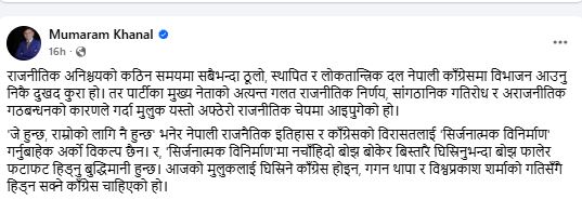 ‘आजको आवश्यकता घिस्रिँदै हिँड्ने कांग्रेस होइन, गगन थापा र विश्वप्रकाश शर्माको गति र सोचसँगै अघि बढ्न सक्ने कांग्रेस मुलुकलाई चाहिएको छ,’ खनालले सामाजिक सञ्जाल फेसबुकमा लेखेका छन्।