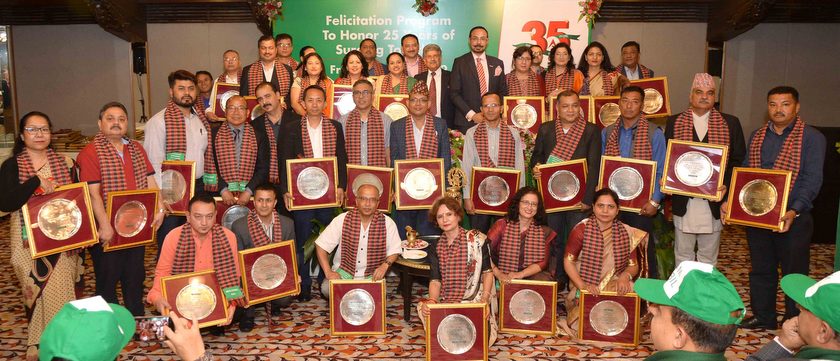काठमाडौं – नबिल बैंकले आफ्नो ३५औं बार्षिकोत्सवको अवसर पारेर बैंकमा २५ वर्ष भन्दा बढी समय निरन्तर सेवा पुर्याएका कर्मचारीहरुलाई सम्मानित गरेको छ । नबिल बैंंकका अध्यक्ष शम्भु प्रसाद पौड्यालले हालै आयोजित एक भव्य समारोहमा उक्त कर्मचारीहरुलाइ कदर स्वरुप स्मारिका प्रदान गरे ।