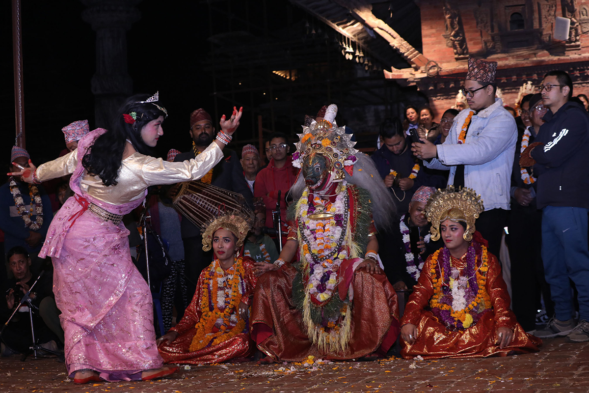 हरेक वर्ष पाटन दरबार परिसरको कात्तिक डबलीमा प्रदर्शन हुने ललितपुरको लोकप्रसिद्ब परम्परागत तथा ऐतिहासिक कात्तिक नाच प्रदर्शनको सातौँ दिन शुक्रबार मध्यराति हिरण्य वधको नृत्य गर्दै कलाकार । यो नाच करिब ३८३ वर्ष अघिदेखि निरन्तर प्रदर्शन हुँदै आएको बताइन्छ । तस्बिर : रत्न श्रेष्ठ/ रासस