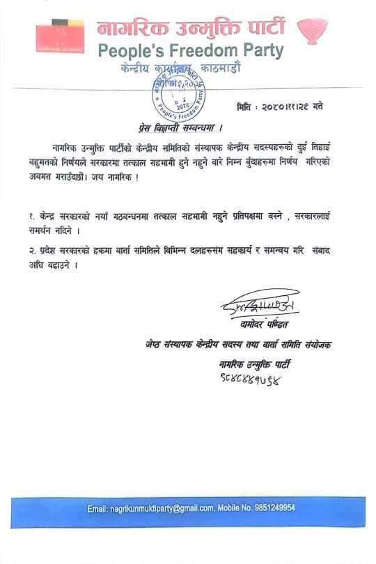 काठमाण्डु – नागरिक उन्मुक्ति पार्टी (नाउपा) ले केन्द्र सरकारमा सहभागी नहुने निर्णय गरेको छ ।