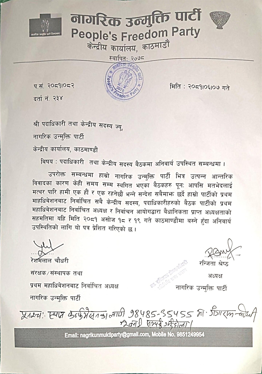 बैठक बोलाइएको पत्रमा रेशम र रञ्जिता दुवैले हस्ताक्षर गरेका छन् ।