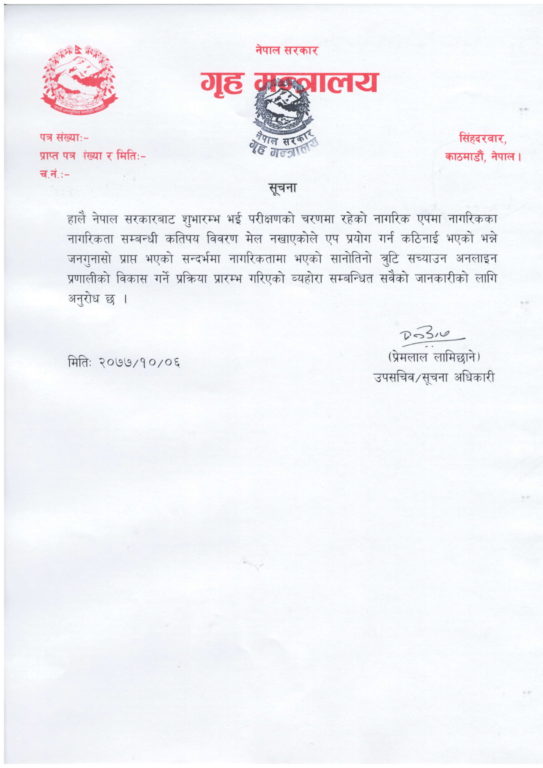 ‘नागरिकताको विवरण मिलेन भन्ने धेरै गुनासो आएका कारण गुनासोलाई द्रुतरुपमा सम्बोधन गर्न हामीले अनलाइन प्रणाली विकाश गर्न लागेका छौं,’ सूचना अधिकारी प्रेमलाल लामिछानेद्धारा जारी सूचनामा भनिएको छ ।