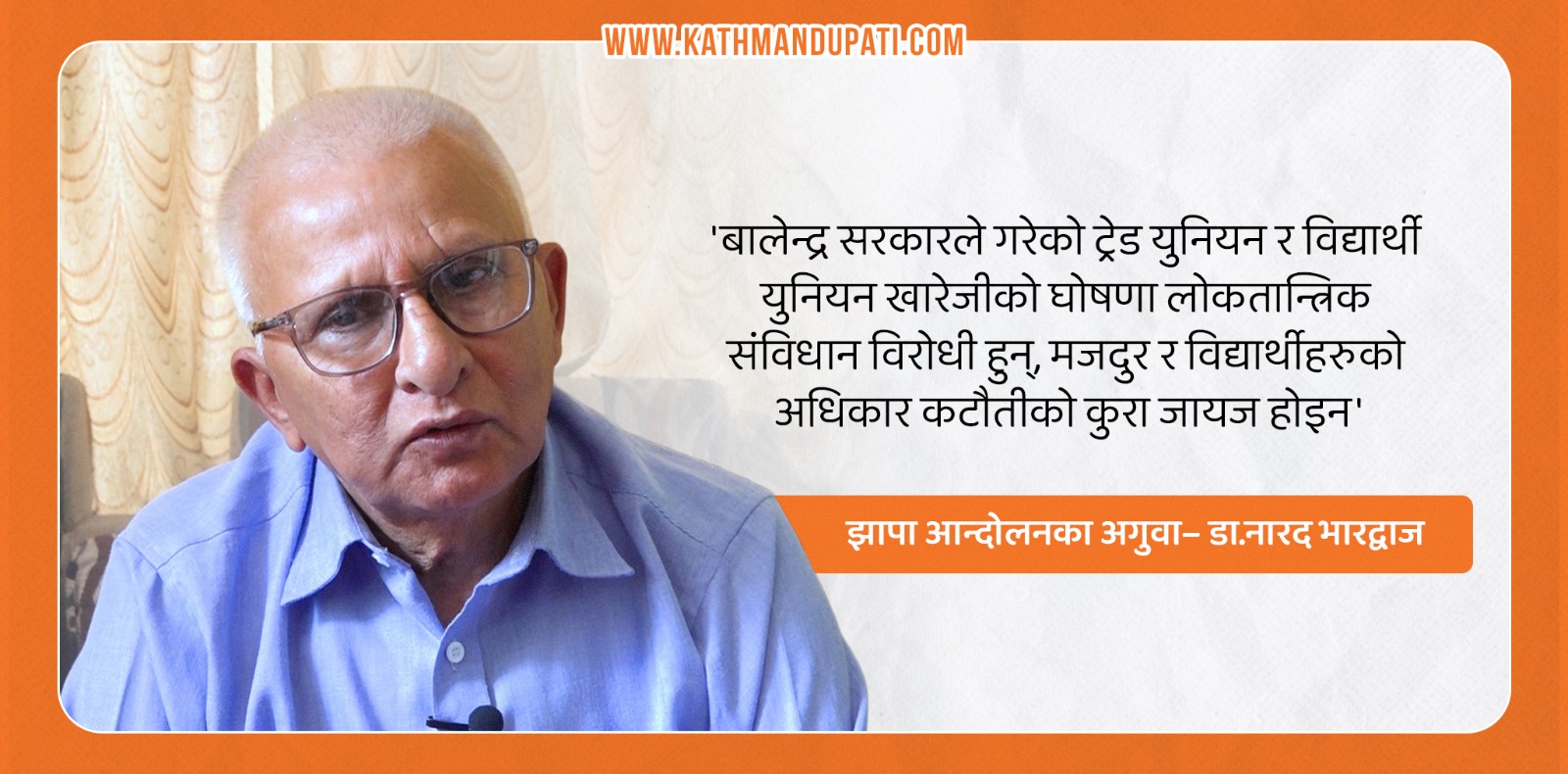 काठमाण्डु– झापा बुधवारेका डा.नारद भारद्वाज झापा आन्दोलनका अगुवा हुन् । निवर्तमान प्रधानमन्त्री केपी शर्मा ओलीसँगै करिब १४ बर्ष जेल जीवन विताएका भारद्धाज ‘झापा विद्रोह’का क्रममा सबैभन्दा कान्छा आन्दोलनकारी थिए । आन्दोलनमा सहभागि भएका कारण १८ वर्षकै उमेरमा उनलाई २०३० सालमा तत्कालिन सरकारले पक्राउ गरेको थियो ।