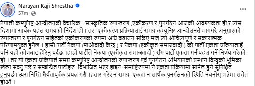 श्रेष्ठले सामाजिक सञ्जाल फेसबुकमा लेखेका छन्, ‘नेपाली कम्युनिस्ट आन्दोलनको वैचारिक सांस्कृतिक रूपान्तरण, एकीकरण र पुनर्गठन आजको आवश्यकता हो र त्यस दिशामा सार्थक पहल समयको निर्देश हो । तर, एकीकरण प्रक्रियालाई समग्र कम्युनिस्ट आन्दोलनले माग गरे अनुसारको रूपान्तरण र पुनर्गठनसहितको एकीकरणको रूपमा अघि बढाउन सकिए मात्र त्यो औचित्यपूर्ण र सकारात्मक परिणामयुक्त हुनेछ ।’
