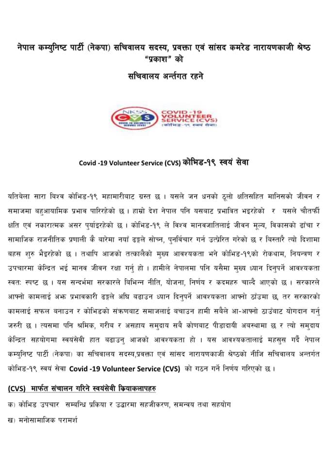 सचिवालयले कोरोनाका कराण समस्यामापरेका नागरिकको सहयोगका लागि ‘कोभिड– १९ स्वयं सेवा’ गठन गरेको जनाएको छ । प्रवक्ता श्रेष्ठको निजी सचिवालयले खासगरी गरिब, श्रमिक र असहाय समुदायका व्यक्तिहरूलाई यो महामारीको समयमा सहयोग पुर्याउन ‘कोभिड– १९ स्वयं सेवा’ गठन गरिएको जनाएको हो ।