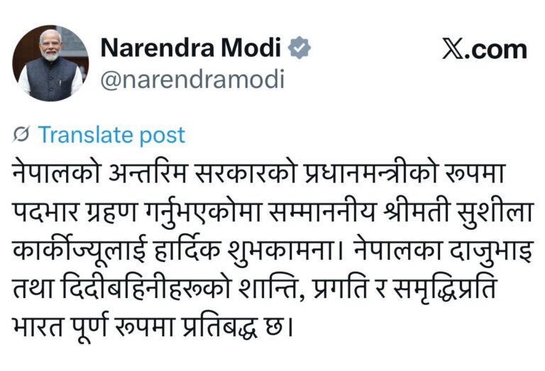 भारतका प्रधानमन्त्री नरेन्द्र मोदीले नेपालको अन्तरिम प्रधानमन्त्रीको रुपमा पदभार ग्रहण गरेकी सुशिला कार्कीलाई शुभकामा दिएका छन् ।