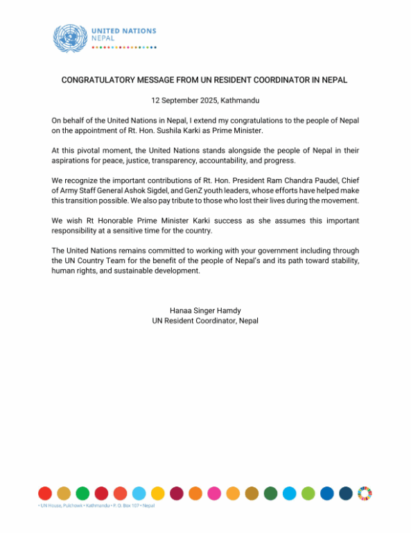 यस्तै अन्तरिम प्रधानमन्त्री कार्कीलाई नेपालस्थित संयुक्त राष्ट्रसंघका आवासीय संयोजक हाना सिंगर हाम्डीले पनि बधाइ दिएका छन् । उनले विज्ञप्ति जारी गरी शान्ति, न्याय, पारदर्शिता, जवाफदेही र प्रगतिको आकांक्षामा नेपाली जनतासँग ऐक्यबद्धता जनाइएका छन्।