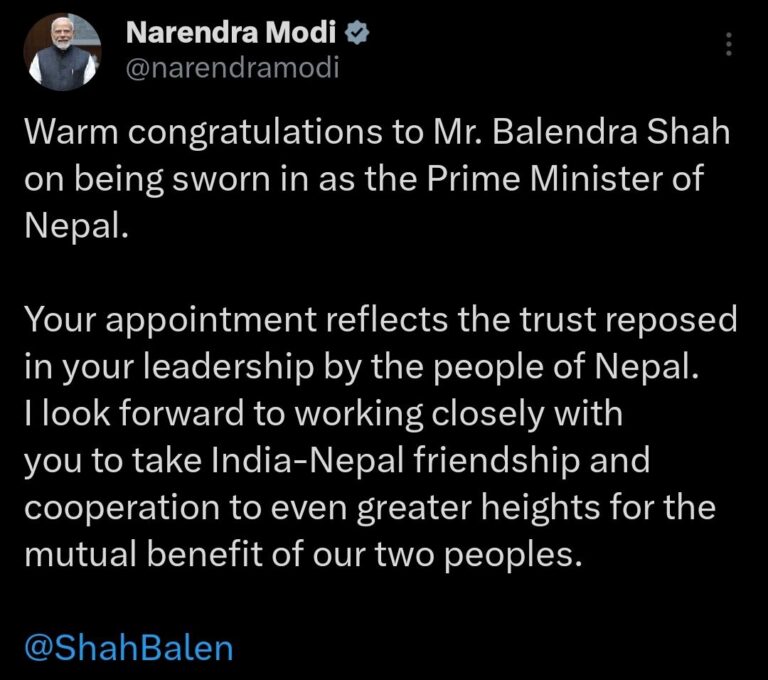 उनले लेखेका छन् ‘श्री बालेन्द्र शाहज्यूलाई नेपालका प्रधानमन्त्रीको रूपमा शपथ ग्रहण गर्नुभएकोमा हार्दिक बधाई।तपाईंको नियुक्ति नेपाली जनताले तपाईंको नेतृत्वप्रति राखेको विश्वासको प्रतिबिम्ब हो। हाम्रा दुई देशका जनताको पारस्परिक हितका लागि भारत–नेपाल मित्रता र सहकार्यलाई अझ उच्च स्तरमा पुर्याउन तपाईंसँग नजिकबाट सहकार्य गर्न पाउने अपेक्षा गर्दछु।’