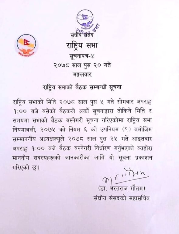 काठमाण्डु – राष्ट्रिय सभाका अध्यक्ष गणेश तिमिल्सिनाले राष्ट्रिय सभाको बैठक २५ पुसमा बोलाएका छन् । संघीय संसदका महासचिव डा.भरतराज गौतमले मंगलबार सूचना जारी गर्दै २५ पुस दिउँसो १ बजे बैठक बस्ने जानकारी दिएका हुन् ।