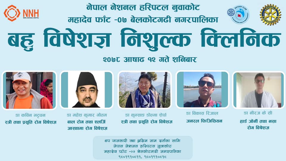 रोटरी कल्ब अफ काठमाण्डु हेल्थ प्रोफेसन र नेपाल नेशनल हस्पिटल कलंकीको सहकार्यमा यही असार १२ गते नुवाकोटको बेलकोटगढी नगरपालीका ७ महादेव फाँटमा शिविर आयोजना हुने नेपाल नेशनल हस्पिटल कलंकीका निर्देशक डा. प्रकाश पौडेलले जानकारी दिए ।