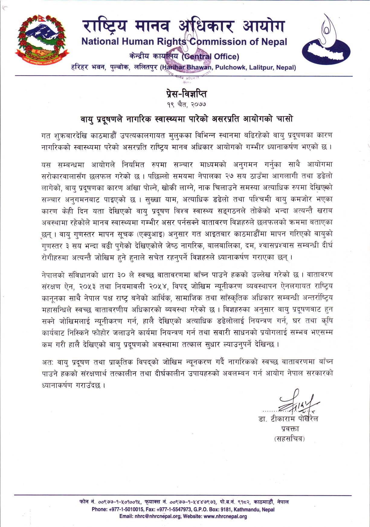 आयोगका प्रवक्त डा. टीकाराम पोखरेलले बिहीबार एक विज्ञप्ति जारी गर्दै गत शुक्रबारदेखि काठमाण्डु उपत्यकालगायत मुलुकका विभिन्न स्थानमा बढिरहेको वायु प्रदुषणाका कारण नागरिकको स्वास्थ्यमा गम्भर असर पारेको भन्दै सरकारको ध्यानाकर्षण गराएका छन् ।