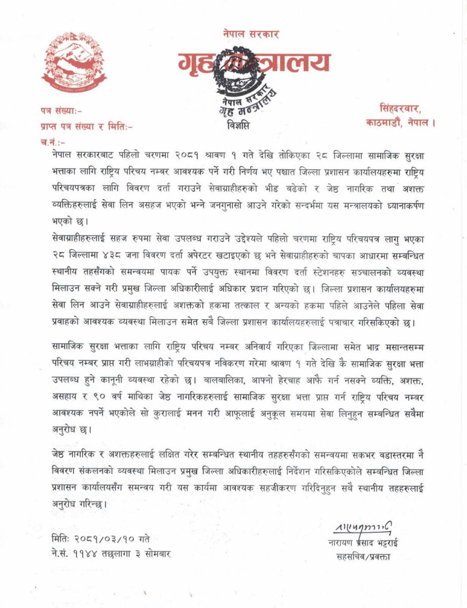 गृह मन्त्रालयका प्रवक्ता तथा सहसचिव नारायणप्रसाद भट्टराईले जारी गरेको विज्ञप्तिमा प्रमुख जिल्ला अधिकारीहरूलाई वडास्तरमा नै राष्ट्रिय परिचयपत्रको विवरण सङ्कलन गर्न भनिएको छ ।
