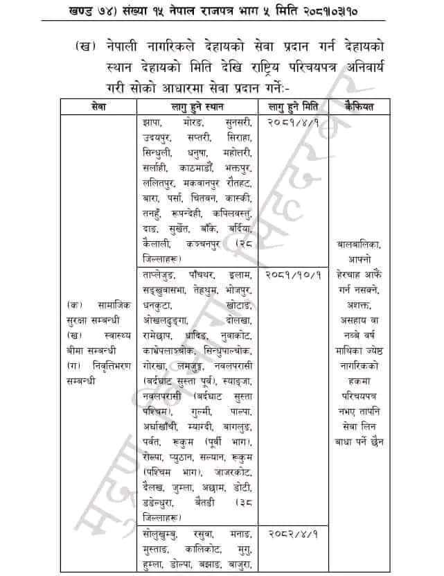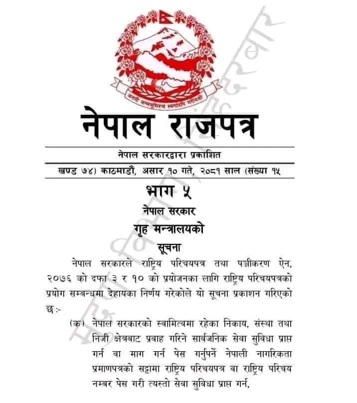 सरकारले राजपत्रमा सूचना प्रकाशित गरी सार्वजनिक सेवा लिन राष्ट्रिय परिचयपत्र अनिवार्य गरिएको समय सीमा सार्वजनिक गरेको छ । उक्त सीमा अनुसार १ साउन २०८१ बाट देशैभरि सबै प्रकारका सार्वजनिक सेवा लिन अब राष्ट्रिय परिचयपत्र हुनुपर्छ ।