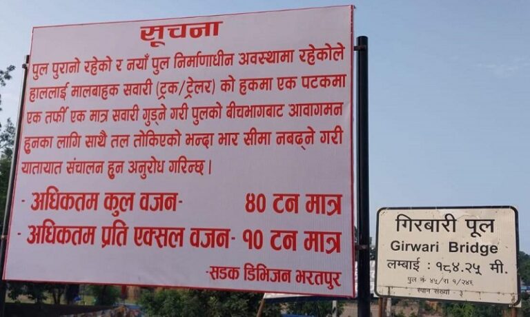 नवलपरासी – गिरुवारी खोला र अरुणखोला पुलमा ४० टनभन्दा बढी भारवहन क्षमता भएका गाडी चलाउन रोक लगाइएको छ । सडक डिभिजन कार्यालय भरतपुरले पुलहरू जीर्ण बनेको र नयाँ पुल निर्माणाधीन भएकाले सुरक्षाको हिसाबले यस्तो गरिएको जनाएको छ ।