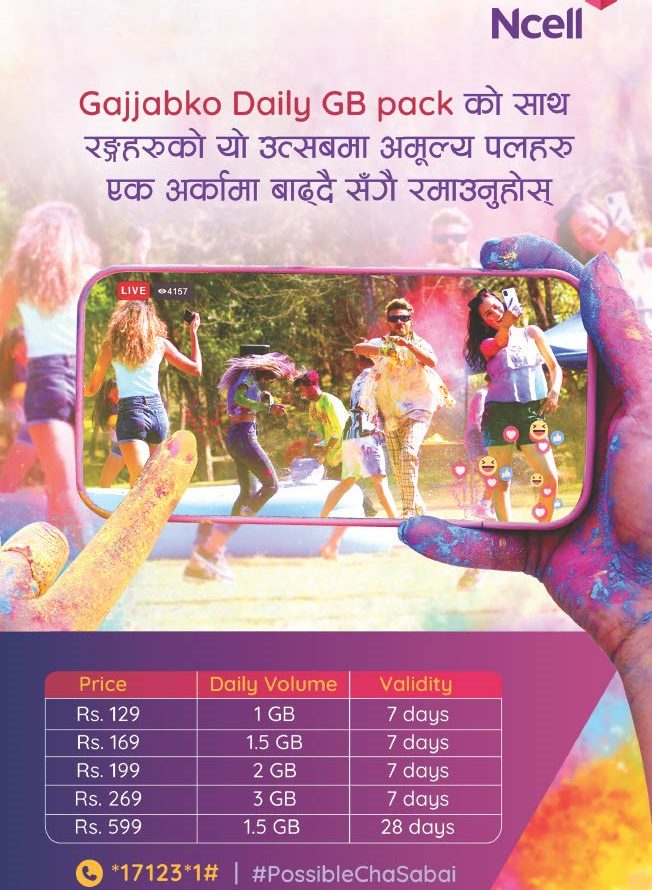 दैनिक जीबी डेटा प्याक अन्तर्गत ल्याइएका नयाँ अल टाइम डेटा प्याकहरु र थप गरिएका डेटा भोल्युमहरुले ग्राहकहरुलाई आफ्ना परिवार तथा साथीभाइसँग सुलभ दरमा सम्पर्कमा रहिरहन र फागु पर्वलाई अझै धेरै रमाइलो बनाउँदै खुसीयाली साटासाट गर्न मद्दत गर्ने विश्वास एनसेलले लिएको छ ।