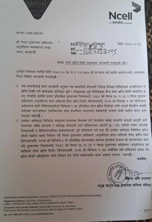 मंसिर १५ गते शेयर खरिद बिक्रीको पूर्व स्वीकृति नदिई एनसेल आजियाटा बिक्री सम्झौतामा भएको खुलासा भएको थियो । सो लगत्तै प्राधिकरणले एनसेल आजियाटालाई पत्र लेख्दै शेयरधनीको शेयर खरिद बिक्री वा नामसारी गर्नुपूर्व प्राधिकरणको स्वीकृति प्राप्त गर्नुपर्ने व्यवस्था स्मरण गराएको थियो ।