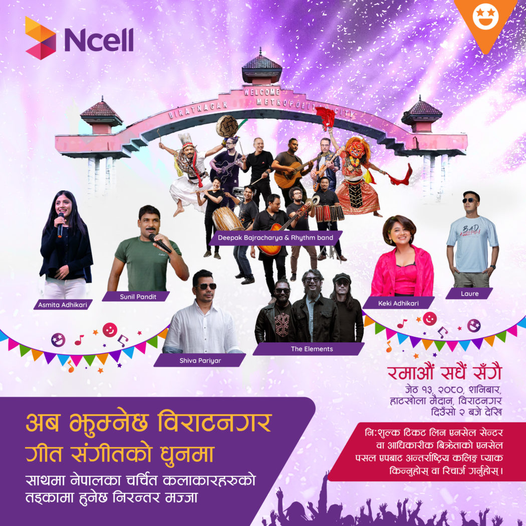 काठमाण्डु – एनसेल आजियाटा लिमिटेडले विराटनगरको हाटखोला मैदानमा जेठ १३ गते शनिबार कन्सर्ट गर्ने भएको छ । कार्यक्रममा चर्चित कलाकार तथा सांगीतिक समुहका प्रस्तुतीहरु रहनेछन् ।
