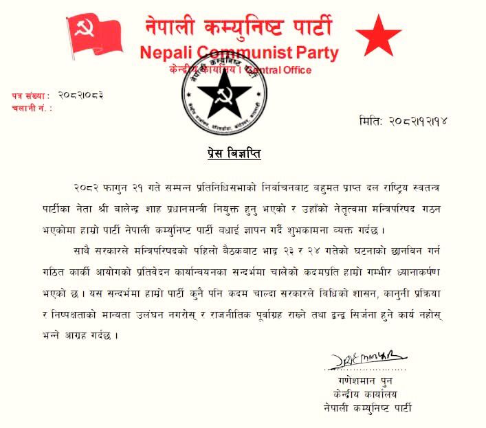 नेकपाको केन्द्रीय कार्यालयका तर्फबाट गणेशमान पुनले शनिबार जारी गरेको प्रेस विज्ञप्तिमा कार्कीको आयोगको प्रतिवेदन कार्यान्वयनमा सरकारले चालेको कदमप्रति ध्यानाकर्षण भएको जनाएका छन् ।