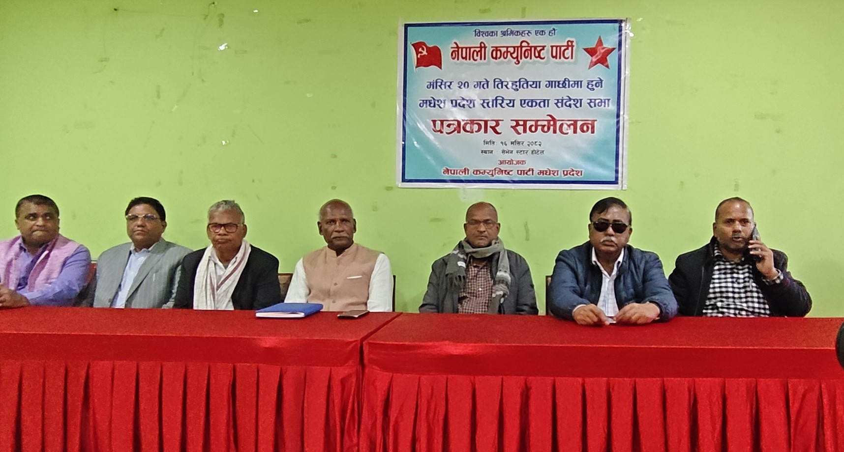 मंगलबार जनकपुरधाममा पत्रकार सम्मेलनमार्फत मंसिर २० गते जनकपुरधामको तुरहुतिया गाछिमो मधेश प्रदेश स्तरीय एकता सन्देश सभाको आयोजना हुने पार्टीका नेता एवं पूर्व मन्त्री महेन्द्र राय यादवले जानकारी दिए ।