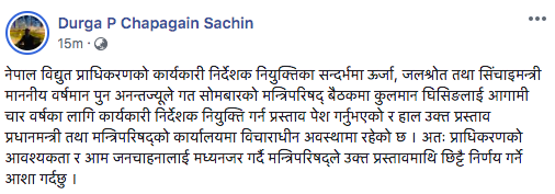 पुनका स्वकिय सचिवले सामाजिक संजाल फेसबुकमा लेखेको स्टाटस-