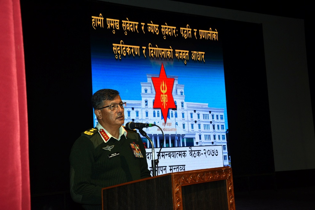 समन्वयात्मक बैठकमा प्रमुख सुवेदार र सिनियर सुवेदारहरुले संगठन भित्रका समस्या र चुनौती, कार्य समिक्षा, वर्तमान वस्तुस्थिती लगायतका विषयहरुमा छलफल गरी राय सुझाव प्रस्तुत गरेका थिए । कोभिड-१९ महामारीकाबीच आयोजना भएको उक्त बैठकमा स्वास्थ्य मापदण्डलाई पूर्णरुपमा पालना गर्दै जंङ्गी अड्डालगायत नेपाली सेनाका विभिन्‍न फर्मेशन तथा युनिट/सव युनिटहरुबाट ८१ जना प्रमुख सुवेदार/सिनियर सुवेदारहरुको सहभागिता रहेको थियो ।